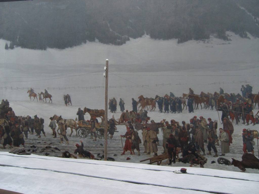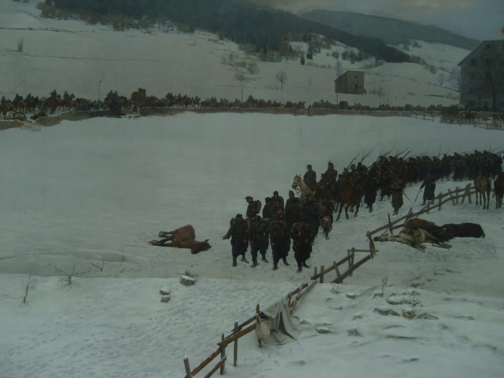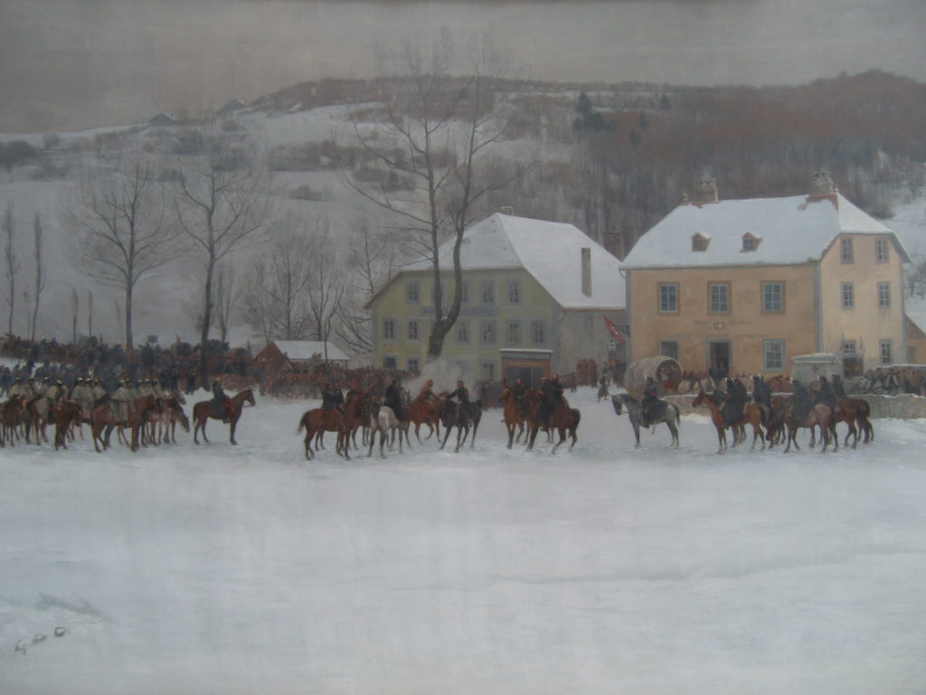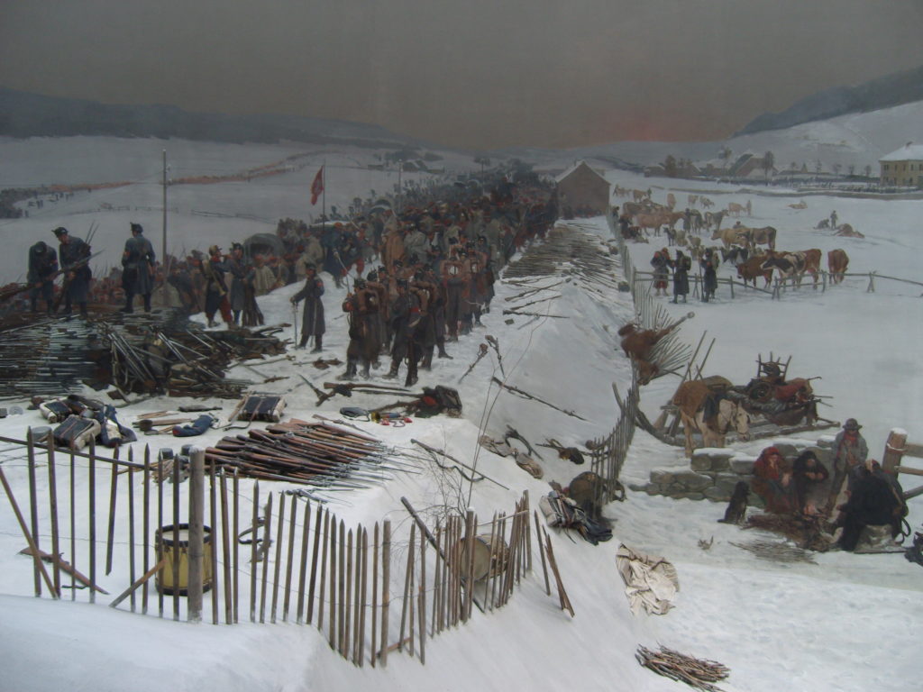 Die Schweiz hat während des Deutsch-Französischen Krieges 1870/71 einer französischen Armee (des Generals Bourbaki) Zuflucht gewährt und sie so vor einer Niederlage/Gefangennahme durch die die Deutsche bewahrt. Das Panorama zeigt das in beeindruckender Weise.